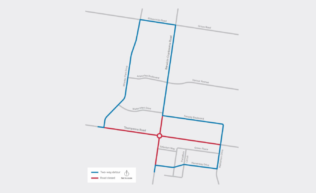 Residents can still access their properties via Thompsons Road or Berwick-Cranbourne Road. Plan for an additional 10 minutes travel time locally and advise visitors from outside the area to allow an extra 30 minutes. Pedestrians will be directed via Matterhorn Drive until the upgrade is complete.